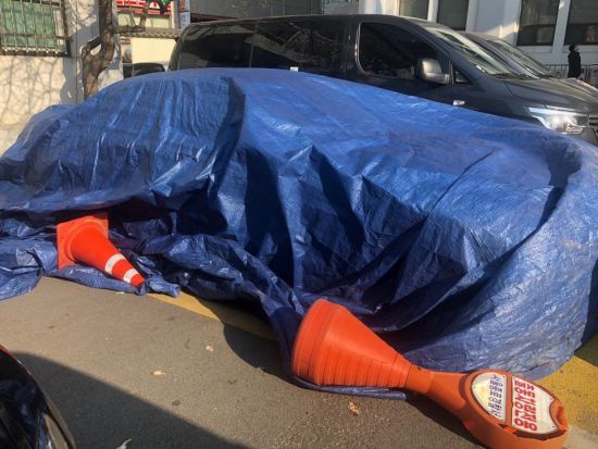 차량으로 청와대 진입을 위해 돌진하다 델타라고 불리는 차단장치를 들이받은 것으로 알려진 김 모 소령의 차량이 4일 서울 종로경찰서에 천막으로 덮여있다. (사진=연합뉴스)